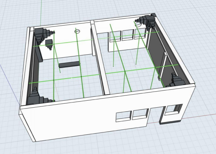Ziel ist es dem Raum, die Aufgrund der ausschließlich durch Beton umgesetzten Bauweise, auftretenden Reflektionen und Hall Geräusche zu entnehmen/absorben. Zur Befestigung dieser Absorber soll in die Halle ein von der Stabilität und Tragkraft überdimensioniertes Rohrgerüst eingebracht werden. Die Absorber werden in Rechteckiger und Quadratischer Form aus einem stabilen Holzgestell, welches mit Stoffen im Grauton überzogen wird und von innen mit Schaumstoff und Mollton ausgefüllt ist gebaut. Gleichzeitig werden alle Seiten jedes Absorbers mit steuerbaren digitalen Leds von Innen beleuchtet sodass ein diffuses Licht einen 3-dimensionalen Leuchtkörper bildet. Die eingebauten Leds sind pro Pixel einzeln ansteuerbar per Artnet-Spi Protokoll. Die Farbeinstellungsmöglichkeiten sollen durch RGBW Leds eine größtmögliche Variabilität der Raumlichtgestaltung möglich machen. Das Rohrstangengerüst soll hierbei noch zwei weitere Funktionen übernehmen. Es soll von der Farbe und Bauart an die übrig gebliebene Verrohrung der Industriehalle erinnern und vom Design den Eindruck erwecken mit dem alten Rohrsystem eine Funktionale Verbindung zu erfüllen. Des weiteren sollen die Rohre die an der Decke über die gesamte Raumfläche mit Knotenpunkten welche Rechtecke Formen verlaufen. Es sollen insgesamt 8 Gerüstrohre mit max. Manteldicke bis zum Boden Führen, in den sie fest in den Beton eingelassen werden. (Siehe Zeichnungen) Dieses Gerüstrohrsystem soll als Halterung und Befestigungsmöglichkeit für eine Vielzahl von Modularen Nutzflächen wie Arbeitsplatten oder Ausstellungs-Plattformen, Ausstellungswänden, Aufhängungsmöglichkeiten für Bilder und Präsentationsflächen dienen. Die entsprechenden Raumverändernden Module sollen durch einfache Gerüstschellen oder bei komplexeren Modulen mit sogenannten sehr vielseitig einstellbaren Superclamps in das Gerüstsystem integriert werden können. Auch das Einbringen zusätzlicher Rohrverbindungen in das System soll eine uneingeschränkte modulare Bauweise für Temporäre Raumgestaltungen ermöglichen.